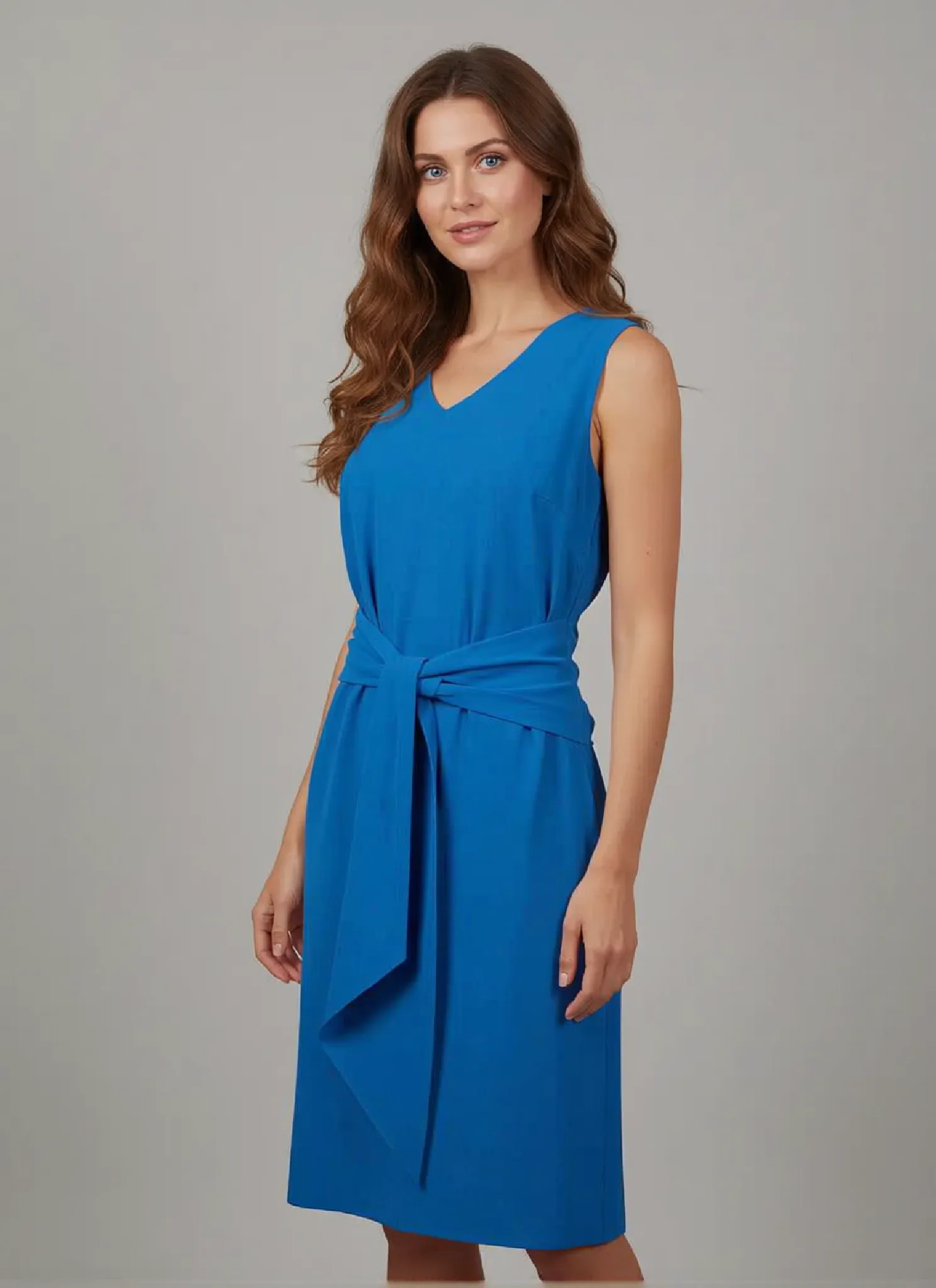 Γυναικείο Λινό Τυρκουάζ Φόρεμα με V Ντεκολτέ & Ζωνάκι