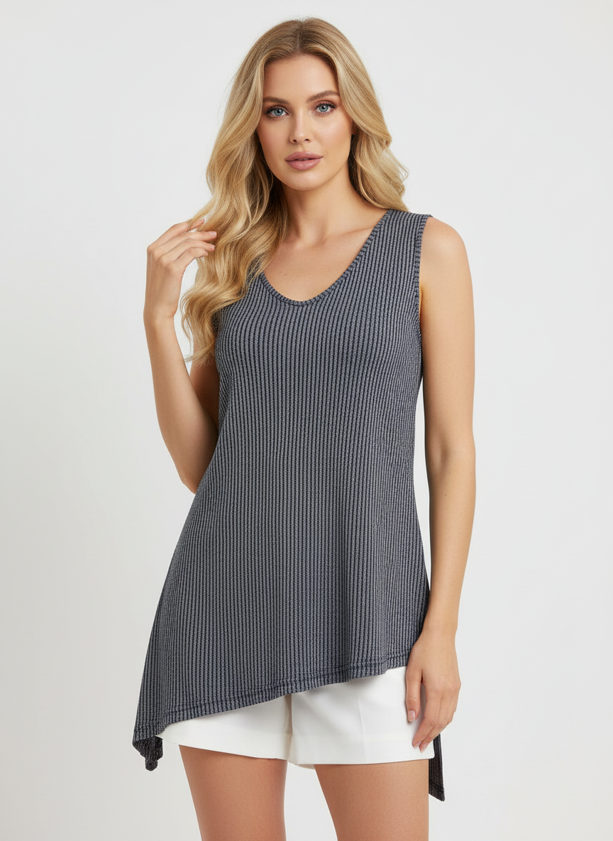 Το rib ύφασμα αγκαλιάζει απαλά το σώμα χωρίς να πιέζει, προσφέροντας μια ισορροπία ανάμεσα στη θηλυκότητα και την άνεση. Η αμάνικη γραμμή και το V‑neck κόψιμο δημιουργούν μια καθαρή, minimal αισθητική που ταιριάζει σε κάθε σωματότυπο και αναδεικνύει το πάνω μέρος του σώματος με διακριτικό τρόπο. Το μπλε χρώμα προσθέτει μια μοντέρνα, ουδέτερη πινελιά που συνδυάζεται εύκολα με όλα τα καλοκαιρινά κομμάτια της ντουλάπας.