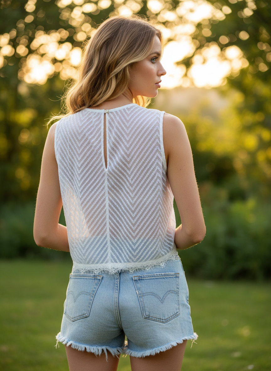 Η γυναικεία λευκή αμάνικη μπλούζα με διάφανο chevron μοτίβο και δαντελένιο τελείωμα αποτελεί ένα από τα πιο αέρινα και κομψά κομμάτια της καλοκαιρινής συλλογής. Ο σχεδιασμός της συνδυάζει ανάλαφρη υφή, θηλυκές λεπτομέρειες και minimal αισθητική, δημιουργώντας ένα ρούχο ιδανικό για ζεστές ημέρες, διακοπές και καθημερινές καλοκαιρινές εμφανίσεις.