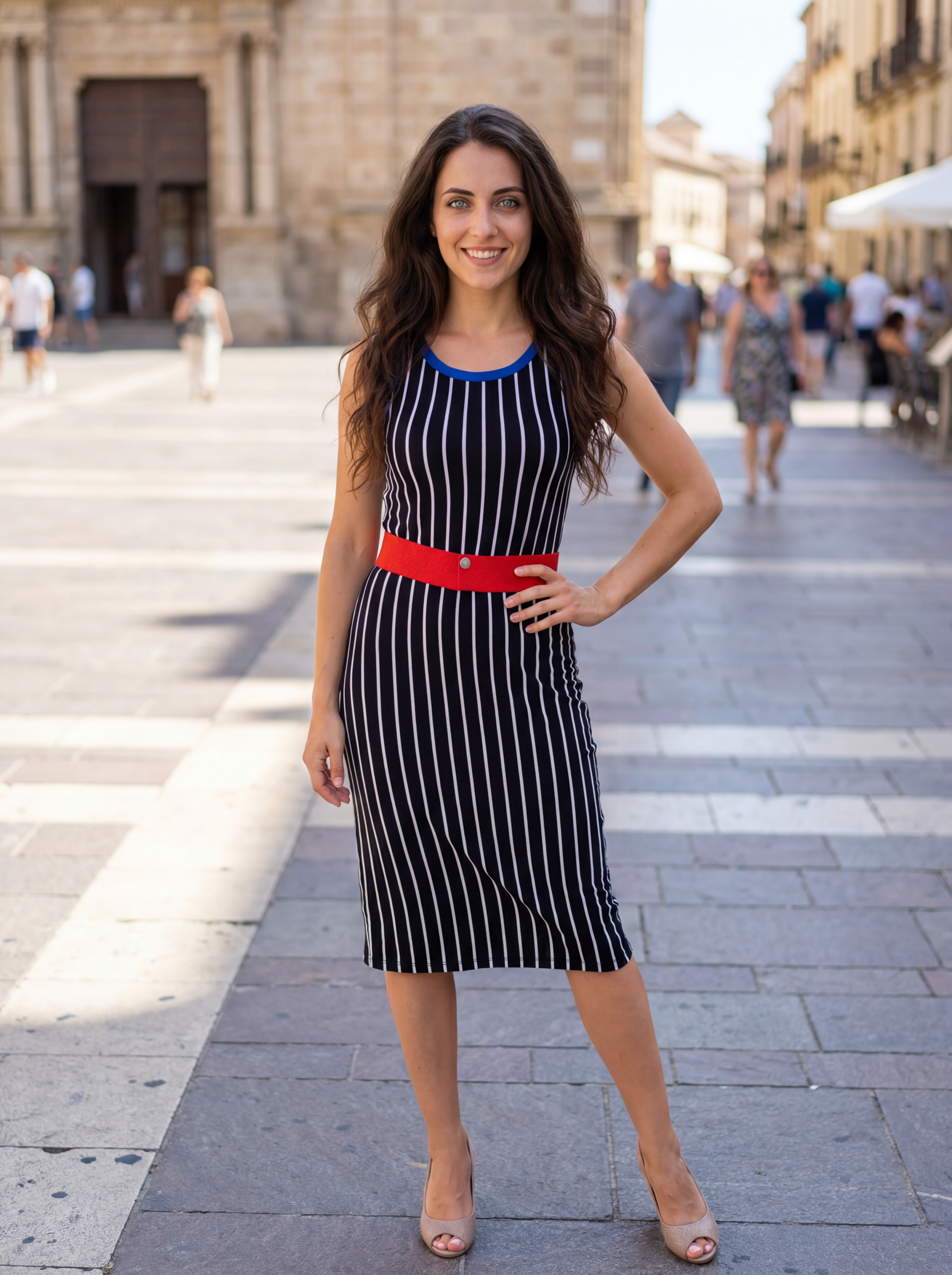 Η κόκκινη ζώνη στη μέση προσθέτει έντονη αντίθεση και επιτρέπει προσαρμογή της εφαρμογής. Μπορείς να τη δέσεις πιο σφιχτά για πιο θηλυκή γραμμή ή πιο χαλαρά για casual διάθεση. Η ζώνη αναδεικνύει τη σιλουέτα και ολοκληρώνει το look με statement χαρακτήρα.