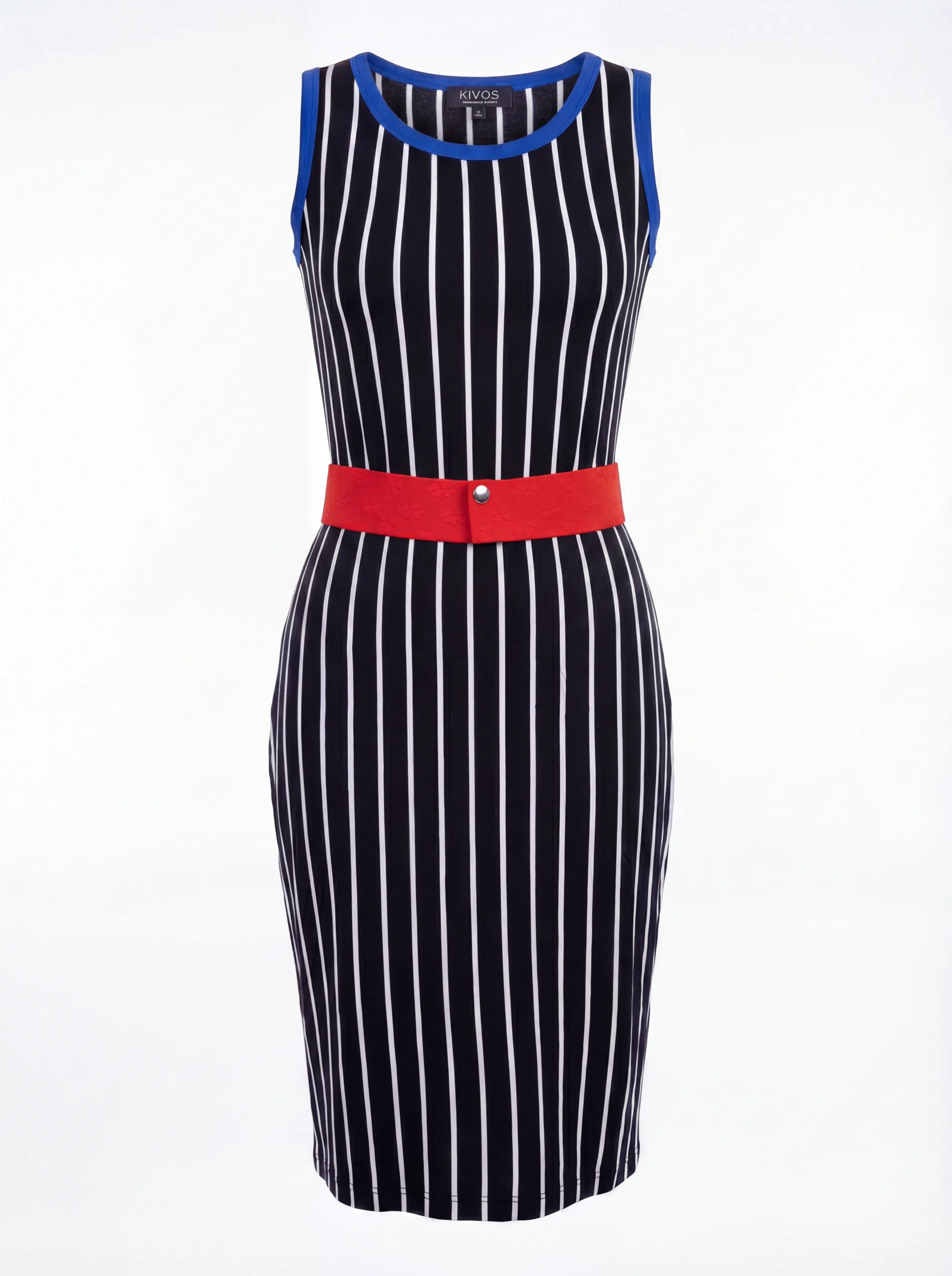 Η V‑λαιμόκοψη ανοίγει οπτικά το πάνω μέρος του σώματος και προσθέτει θηλυκότητα. Το μπλε τελείωμα στη λαιμόκοψη και στα μανίκια δίνει μια μοντέρνα πινελιά που κάνει το φόρεμα να ξεχωρίζει. Η sleeveless γραμμή προσφέρει δροσιά και άνεση, ιδανική για ζεστές ημέρες.