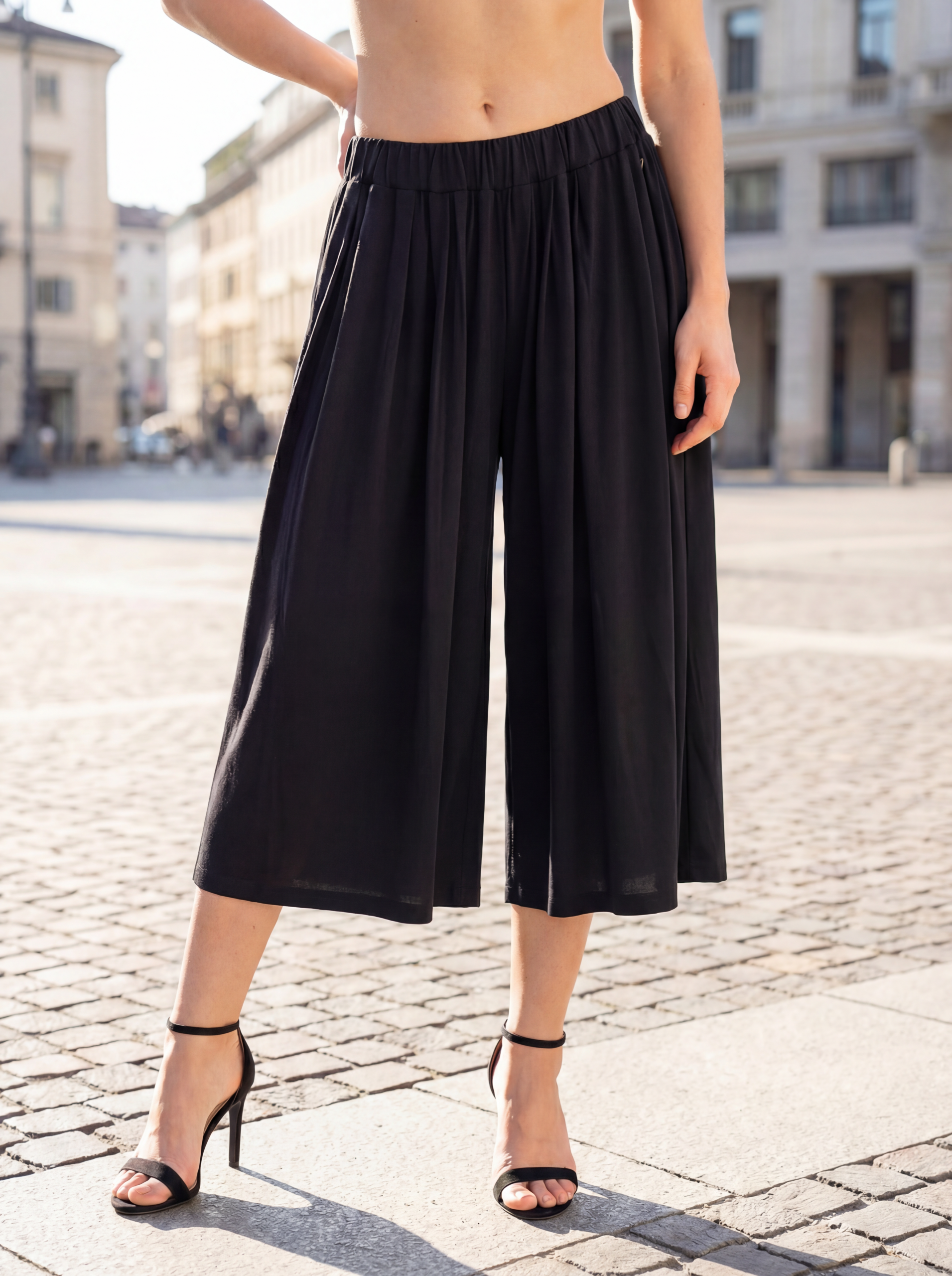 The black color offers endless styling possibilities. Pair the culotte with crop tops, sleeveless blouses, shirts or basic T‑shirts. Wear it with sneakers for a casual look, sandals for a summer vibe or heels for a chic, elevated appearance. It works perfectly for coffee dates, travel, city walks and evening outings.